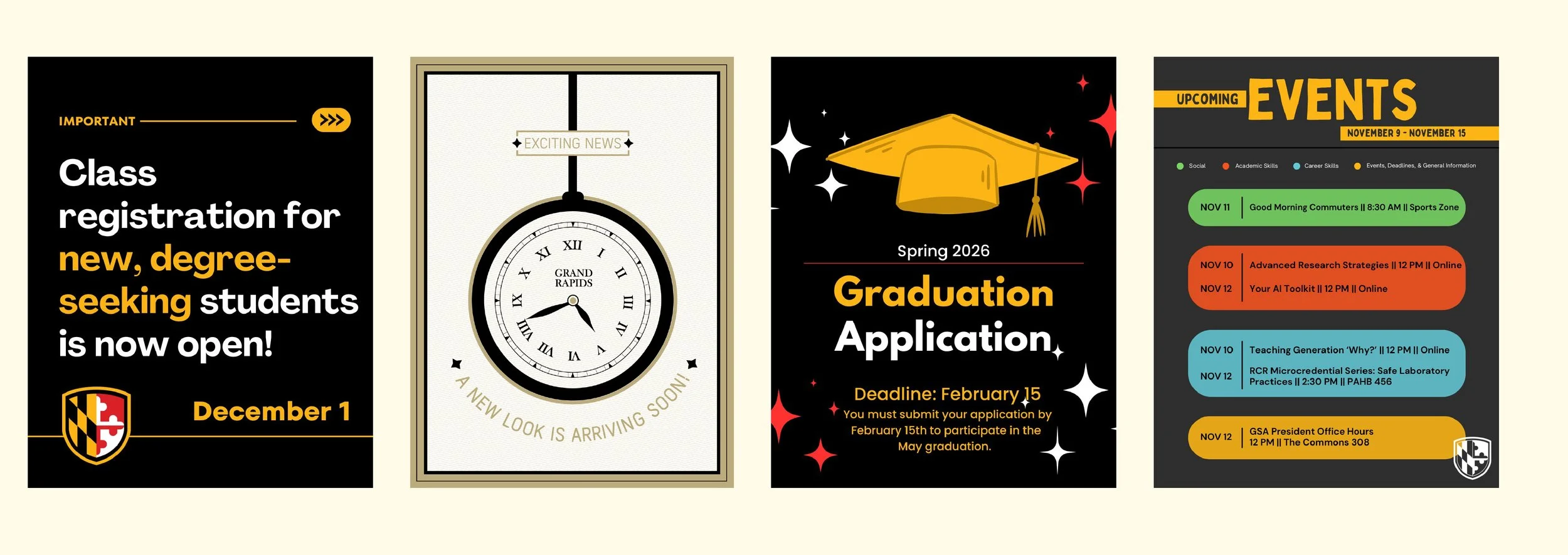 During my time in Student Activities at Frostburg State University and my time in the Graduate School at UMBC, I had the opportunity to manage their social media accounts, which included creating all content. This included content for various kinds of events and deadlines. I have also created freelance social media content.
